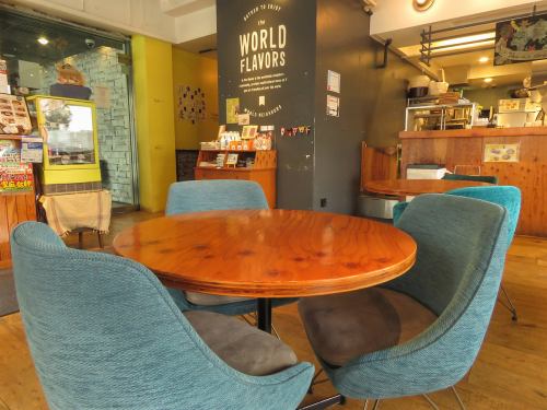 木の温かみ感じるシンプルで落ち着いた大人空間。。アンティークなベンチソファー、ゆったり座れるボックス席、少人数用のまるテーブルにはカラーな椅子が並びます!ゆっくりした時間が流れる店内で、世界の料理をお楽しみください♪